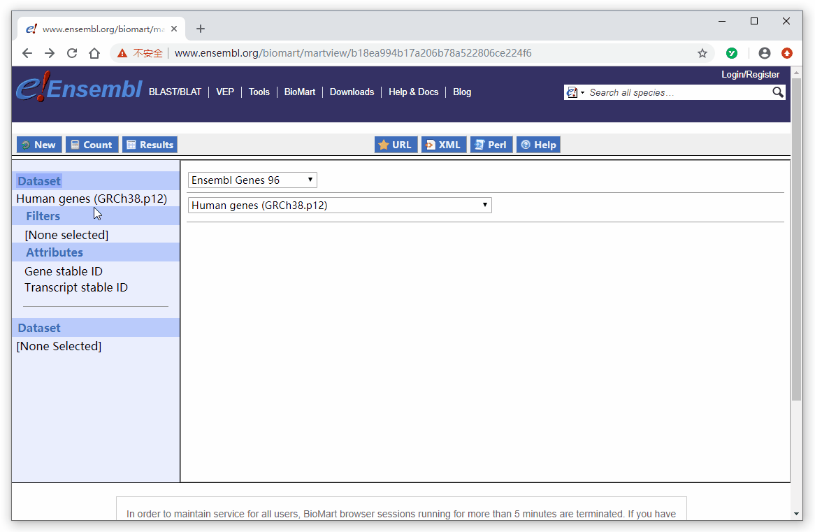 Ensembl数据库,下拉选最新版本的Ensembl Genes 96,点击选择人类对应的数据集Human genes(GRCh38.p12)。