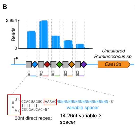 本月中旬,美国加州萨尔克生物研究所的Silvana Konermann在CELL发表了一篇关于新的靶向RNA的CRISPR-Cas系统。研究者通过全新的计算机算法和新的CRISPR Effector寻找策略(即利用CRISPR array来钓取候选序列),在21175个候选序列附近找到了408个可能的Cas蛋白家族,最终在诸多蛋白中找到了Cas13d,上面有三个哥哥13a,13b和13c,(小编猜测下一个应该是13e“十三姨”了)。Cas13d是已发现的所有2类Cas中分子量最小的,只有930个氨基酸残基够成,作者为此很兴奋,取了一个响亮的名字VI-D。