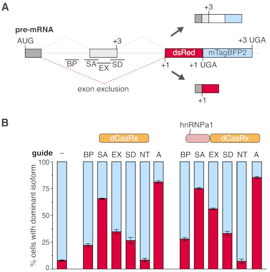 行了,CasRx在RNA敲降方面的能力是没谁了。本来可以结束了,但是发表CELL怎么也得和治疗人的疾病有关才能够逼格。作者冥思苦想,发现了一个点,失活了CasRx的HEPN(dCasRx)使其丧失剪切能力,但是可以扰乱pre-RNA成熟过程中的拼接。所以作者先用一个双色报告基因验证了dCasRx的捣乱能力,发现dCasRx可以干扰内含子的插入,让红色更多的表达。