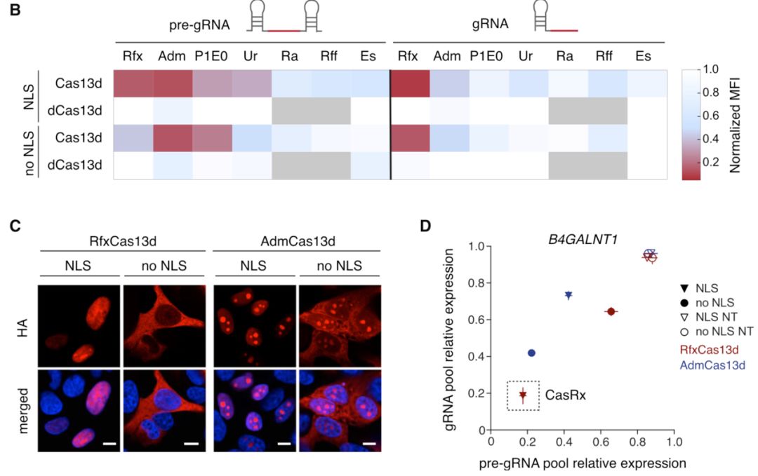 Rfx虽然好用,但是需要入核序列NLS才行,Adm虽然不需要入核序列,但它更喜欢gRAN。Rfx对pre-gRNA还是gRNA一视同仁都能在一起愉快的工作。因此作者终于找到了细胞上编辑RNA的利器CasRx。