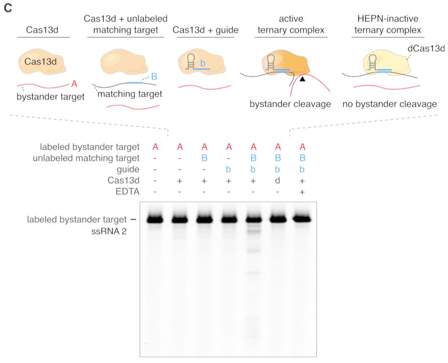 本来做出来这个结果,体外实验就可以了,但是作者发现Cas13d在gRNA和目标RNA(B)存在的情况下能够对非目标RNA(A)进行剪切,也就是说Cas13d在干活的时候会伤及无辜。