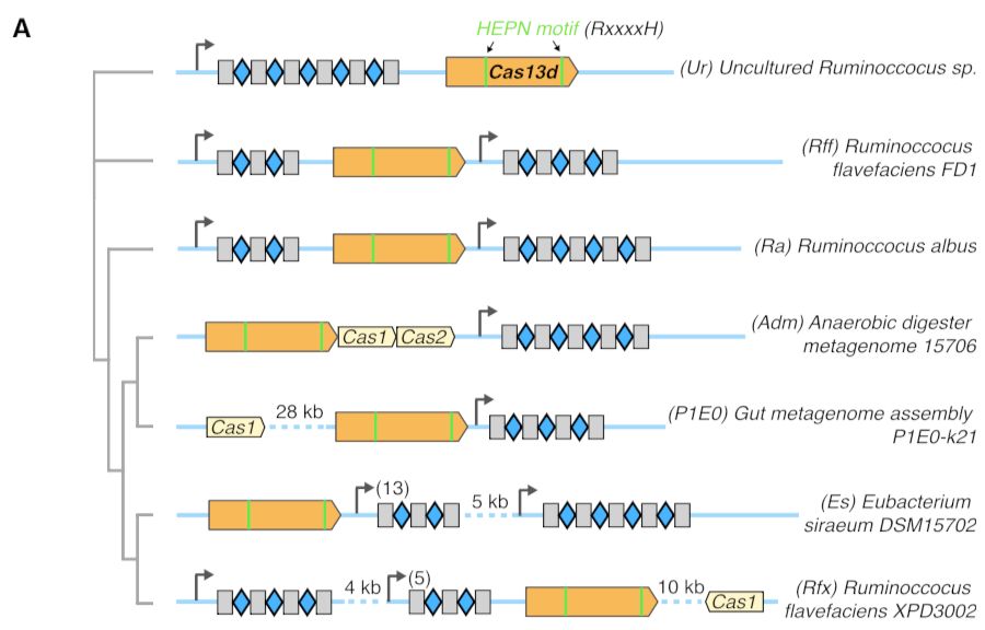 Cas13dCRISPR大多存在于瘤胃球菌属(Ruminococcus)的肠道革兰氏阳性益生菌中,表现为多样的CRISPR结构,在7个细菌中发现了各自的Cas13d。